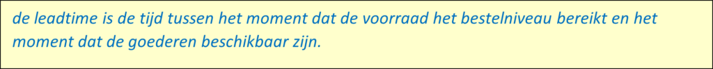 Er zal altijd enige tijd verlopen tussen het moment dat je constateert dat je de voorraad moet aanvullen en het moment dat je de bestelde artikelen beschikbaar hebt voor levering aan de afnemers. A Vergelijk het maar met tanken. Je hoeft niet direct te tanken als je merkt dat je benzine op raakt. Je wilt een ruime voorraad, waardoor je niet voortdurend naar je benzinemeter hoeft te kijken en ook genoeg brandstof hebt als je nog een stuk moet rijden tot de eerstvolgende benzinepomp. Daarom besluit je te gaan tanken ruim voor de tank leeg is. Bij voorraadbeheer zul je, net als bij het tanken, dus een (bestel)order moeten plaatsen voor de voorraad op is, want je wilt de nieuwe zending tijdig beschikbaar hebben. Je stelt daarom een bestelniveau in. Komt je voorraad daaronder (of precies op), dan is het tijd om nieuwe voorraad te bestellen. De tijd tussen het moment dat je voorraad het bestelniveau bereikt en het ogenblik waarop de goederen daadwerkelijk voor uitgifte beschikbaar zijn, wordt de leadtime (L) genoemd. Als je de te verwachten vraag gedurende de leadtime kunt inschatten, dan kun je terugrekenen bij welk voorraadniveau je moet bestellen.