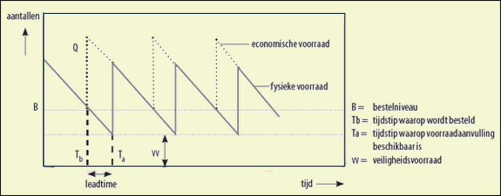Het bestelniveau B kies je dus op basis van de te verwachten vraag gedurende de leadtime (de daling van de voorraadlijn tussen Tb en Ta) plus de gewenste veiligheidsvoorraad (vv).
