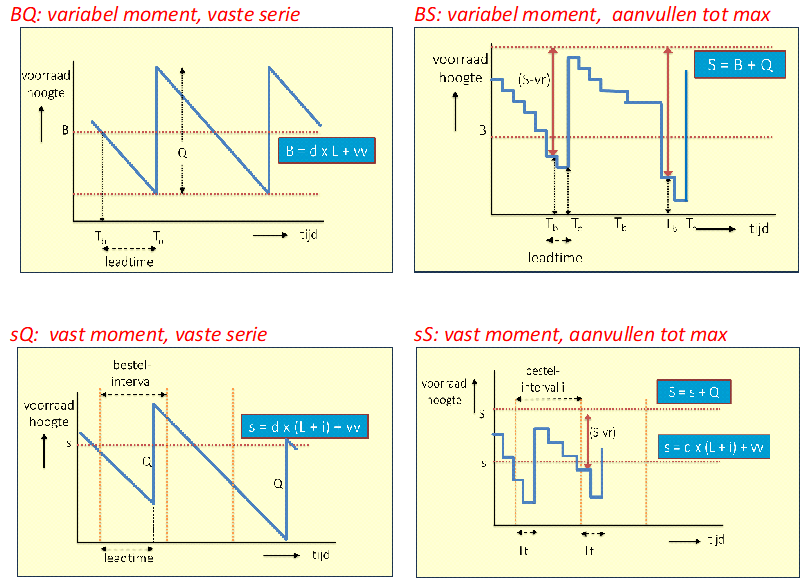 In de figuren 4 zijn de vier bestelsystemen grafisch weergegeven. Je kunt in één oogopslag zien dat de methoden BQ en sQ bij situaties met een gelijkmatige vraag (rechte voorraadlijnen) horen en dat BS en sQ geschikter zijn voor situaties met sterker wisselende vraag (getrapte voorraadlijnen).