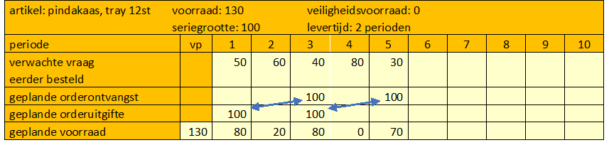 Als je vandaag (dus in periode 1) een order van 100 trays plaatst in de regel ‘geplande orderuitgifte’, worden die pas na 2 perioden geleverd, dus in periode 3. Zie de regel ‘geplande orderontvangst’. Dat is bij de voorspelde vraag in de periode 1, 2 en 3 dus net op tijd om niet zonder voorraad te komen. Veiligheidsvoorraad is (volgens de kop van de tabel) niet nodig, het is dus niet erg dat je geplande voorraad in periode 4 op 0 uitkomt. Als je maar op tijd weer genoeg hebt voor de perioden die daarna komen. Je gaat dus verder met plannen en kijkt naar de verwachte vraag in de volgende kolommen. Je zult dan merken, dat je in periode 5 een aanvulling van de voorraad nodig hebt. Om die op tijd binnen te hebben, moet je in periode 3 dus een order plaatsen.