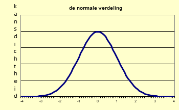 • Hoe hoger de top in het midden van de grafiek (dus hoe steiler de grafiek links en rechts van het midden verloopt), hoe meer kans dat zich een waarde in de buurt van het gemiddelde voordoet. De standaard spreiding is dan klein.