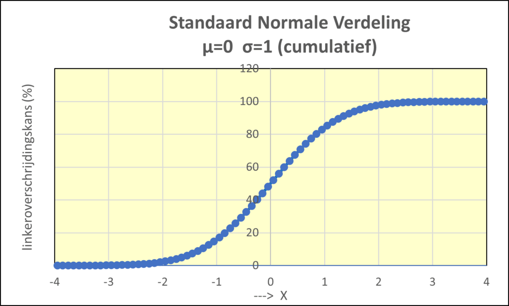 In de praktijk zul je meestal uitgaan van een frequentieverdeling in plaats van een continu doorlopende kansverdeling. Als ‘het’ verschijnsel normaal verdeeld is en je heel veel waarnemingen doet en de klassen van de turflijst maar klein genoeg zijn, zal de frequentieverdeling de vorm heel dicht benaderen van de Gauss-klok. Zie figuur 4, waarin we met een klassebreedte van 0,1 (dus 0,1 x sigma) de geturfde kansdichtheid en tonen van een verschijnsel dat normaal is verdeeld. Figuur 5 is een weergave van de onderschrijdingskans (ook wel genoemd de linker overschrijdingskans).