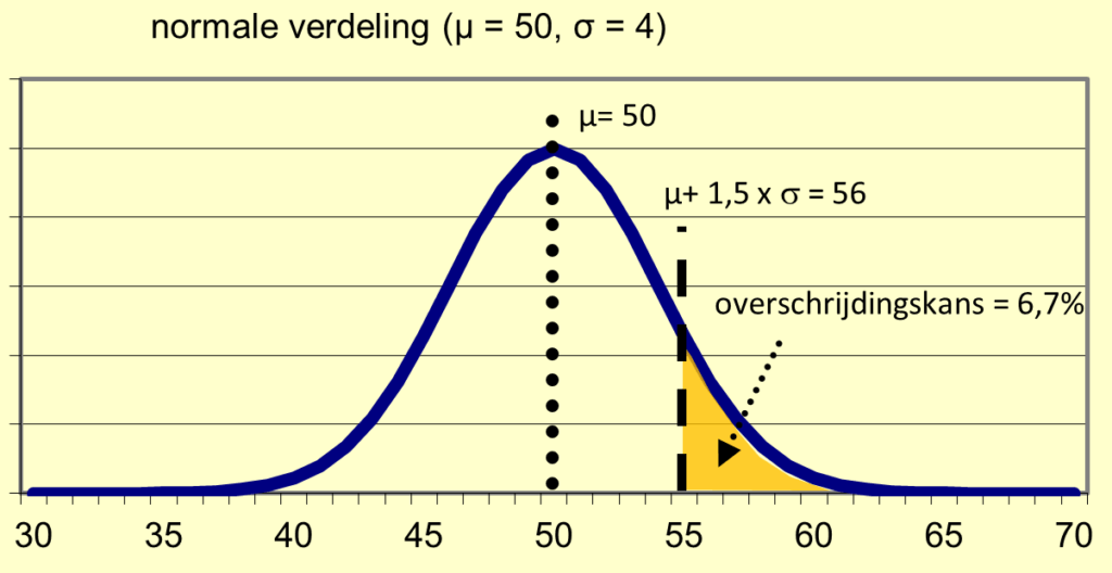 De overschrijdingskans bij de 1,5 x σ uit het voorbeeld, de kans op een vraag groter dan een bepaald aantal, hebben we weergegeven in Figuur9. Het is het oppervlak van de kansverdeling rechts vanaf X=56 (tot het oneindige).