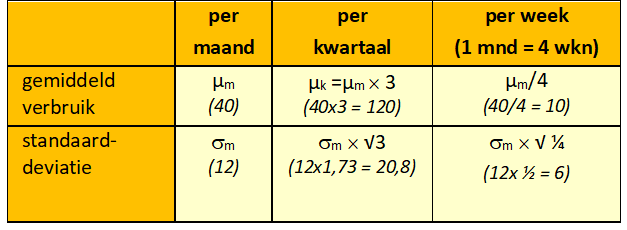 1 week : σm x √0,25 = σm x 0,5 stuks (als 1 maand = 4 weken)