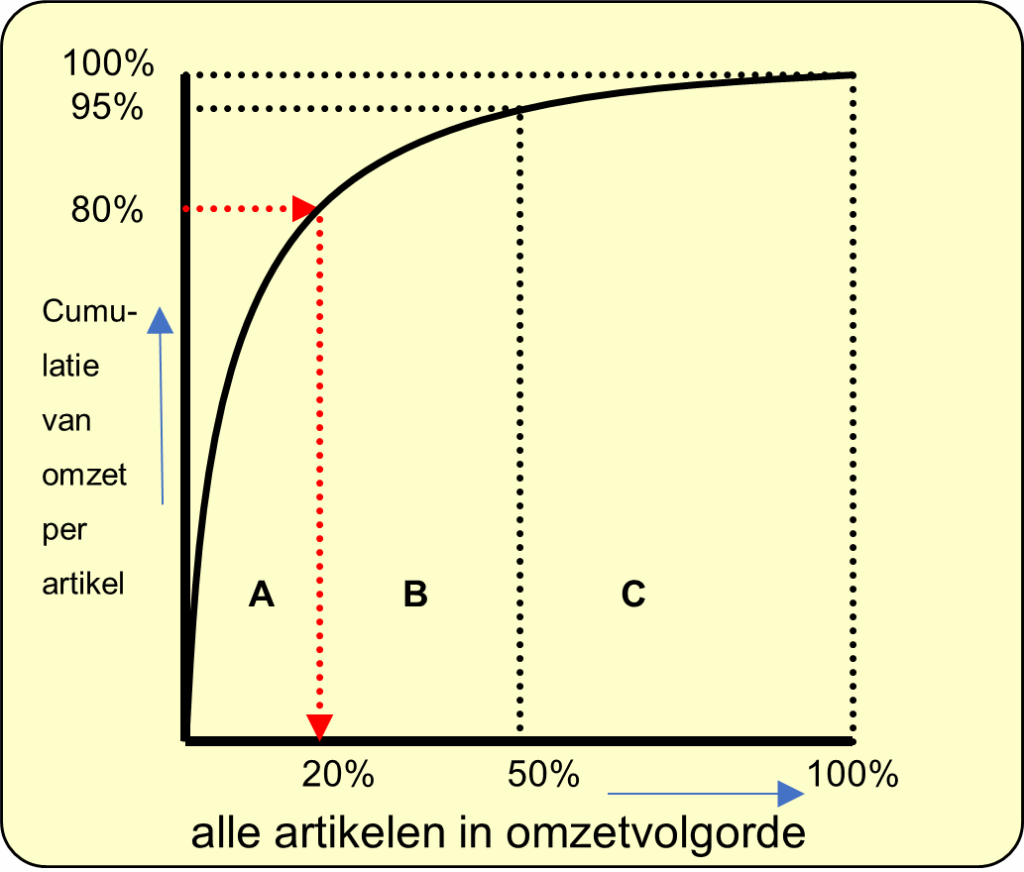 In figuur 1 staan langs de horizontale as alle artikelen in de volgorde van hun omzet en langs de verticale as de – artikelgewijs gecumuleerde – omzet. In de figuur kun je aflezen dat (in dit geval) 80% van de omzet wordt gerealiseerd met 20% van het assortiment.