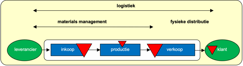 Het gedeelte van de goederenstroom vanaf het bestellen bij leveranciers, via de goederenontvangst tot en met de laatste fabricagefase, meestal verpakken van de geproduceerde artikelen en het afleveren van gereed product aan het magazijn noemen we Materials Management. De activiteit die begint met het op voorraad leggen van de goederen in het magazijn gereed product tot en met de aflevering van de producten (en de eventuele retournames) aan de klanten heet Fysieke Distributie.
