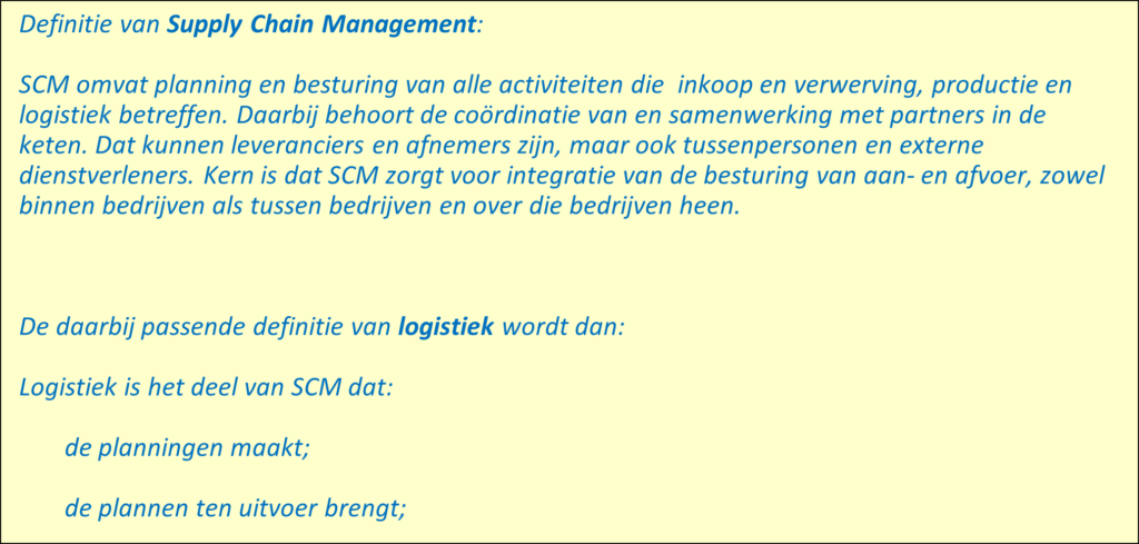Mede om het dramatische keteneffect te beperken, gingen bedrijven steeds meer informatie delen. Dat kan heel ver gaan: samen vraagvoorspellingen maken, voorraadinformatie aan elkaar doorspelen, samen prioriteiten stellen in de productievolgorde en samen beslissen wanneer (en met hoeveel) de verkoopvoorraad van gereed product (aan het einde van de keten) zal worden aangevuld. Zo ontstond Supply Chain Management (SCM). We geven hieronder aan hoe breed zowel Logistiek als SCM kunnen worden gedefinieerd. Deze definities wijken af van de eerder genoemde definitie van de VLM.
