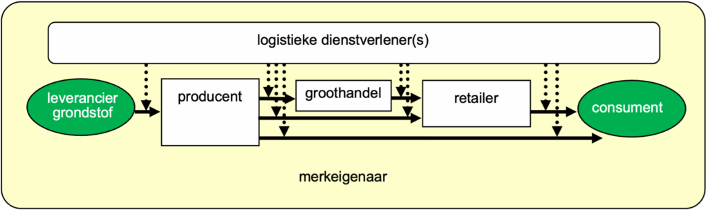 In figuur 13 zie je een schematisch overzicht van een keten, met een bijzondere plek voor de merkeigenaar en voor de logistieke dienstverlener(s).