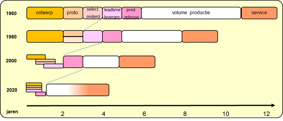 De time-to-market kon aanzienlijk worden verkort door het ontwerp en de bouw van prototypes te combineren en al tijdens de ontwerpfase leveranciers bij het product te betrekken. Met de opbouw van de fabricagelijn wordt al begonnen tijdens de laatste ontwikkelfase van het product (de paarse blokjes in figuur 3 met ‘productie opbouw’. Omdat ook de periode korter is geworden waarin een product ‘loopt’, is de tijd van ‘volume productie’ korter geworden. Deze gaat nu geleidelijk over in de fase van service, van levering ten behoeve van reparatie en vervanging.