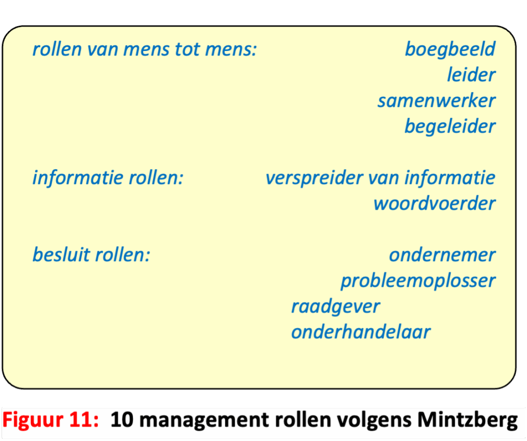 Mintzberg vat de taken van een manager samen in tien rollen. Deze tien rollen zijn natuurlijk ook van toepassing op logistiek managers. Ze worden weergegeven in figuur 11.
