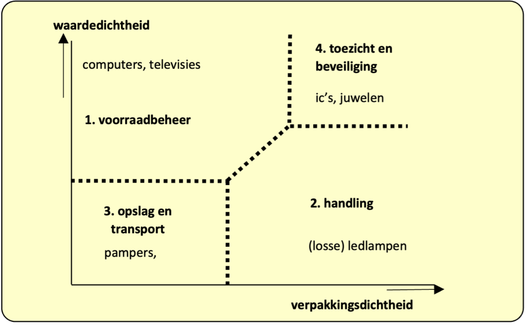 Een grote verpakkingsdichtheid betekent veel dozen per transport- of opslageenheid met relatief hoge kosten voor handling (doos voor doos). Een hoge waardedichtheid betekent dure goederen met relatief hoge voorraadkosten.