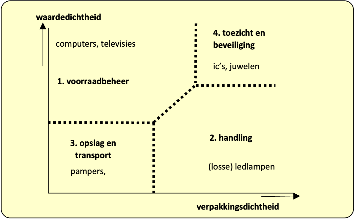 We gaan niet dieper op deze begrippen in in deze Module. Een toelichting op de betekenis van de begrippen waardedichtheid en verpakkingsdichteid voor de logistiek, vind je in de Verdieping van Module 2.