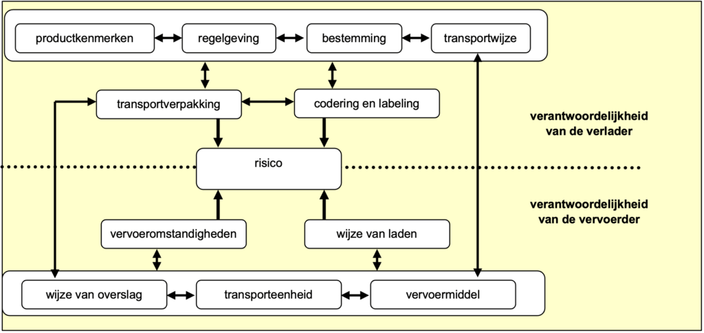 In Figuur 3 zie je een vereenvoudigd beeld van de factoren waaraan transportverpakking moet voldoen. Het plaatje is in twee delen verdeeld: een deel met de verantwoordelijkheid van de verlader en een deel met het verantwoordelijkheidsgebied van de vervoerder. Schade kan ontstaan door ondeugdelijke verpakking of door verkeerde beladingwijze (stuwage). Andere mogelijke oorzaken van schade zijn bijvoorbeeld: