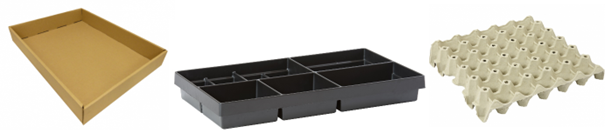 Naast kartonnen dozen kun je ook trays van karton (of kunststof) gebruiken (zie