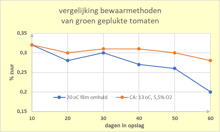 Onderstaand een aan Thomson, Prange et all. ontleent voorbeeld waarin twee bewaarmethoden voor groen (bijna rijp) geplukte tomaten worden vergeleken: in folie verpakte tomaten, bewaard bij 20 oC, ten opzichte van ‘gewoon’ in kistjes verpakte tomaten, bewaard in een ruimte met een temperatuur van 13 oC en slechts 5,5% zuurstof.