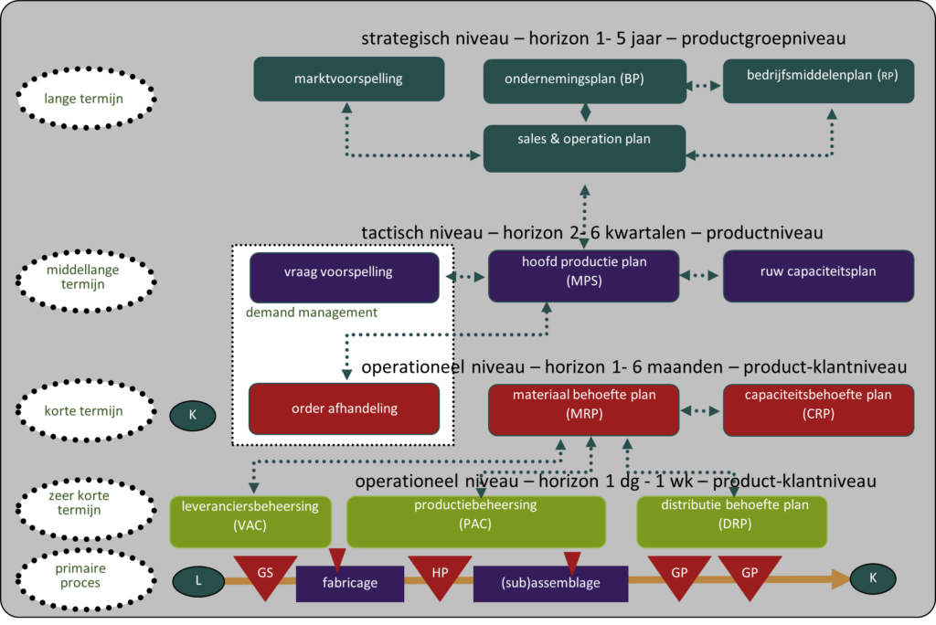 Helemaal onderin in figuur 28 staat het primaire proces met daar direct boven de planningsmethoden waarmee het primaire proces operationeel kan worden aangestuurd. Helemaal bovenin staat de lange termijn, de strategische planning. Van boven naar beneden gaat het dus van lange termijn planning over op de dagelijkse praktijk. Horizontaal verloopt het planningsproces als een afstemming van enerzijds de linkerzijde, de markt of klant (marktvoorspelling – vraagvoorspelling – bestelling) en anderzijds de rechterzijde, de beschikbare middelen. Door die afstemming komt het Sales & Operationsplan tot stand voor de langere termijn, het hoofdproductieplan (MPS) voor de middellange termijn en het materiaal behoefteplan (MRP voor de korte termijn. Van het MRP worden de plannen voor de zeer korte termijn afgeleid, waarin bijvoorbeeld op basis van prioriteiten de productievolgorde wordt bepaald.