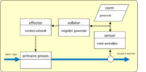 Het hele proces van meten, vergelijken en ingrijpen, is hieronder afgebeeld met als onderwerp de thermostaatregeling van een centrale verwar­ming.