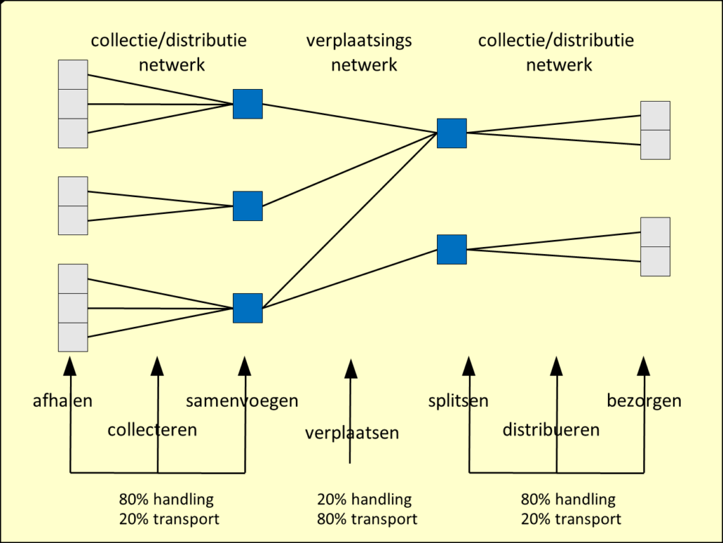 We kunnen onderscheid maken in twee typen netwerken: collectie- en distributienetwerken enerzijds en verplaatsingsnetwerken anderzijds, zoals in is weergegeven. Het verschil tussen deze netwerken komt tot uiting in de mate waarin de activiteiten gericht zijn op laadeenheden, die relatief veel transformatie- en/of afhandelingsfuncties vragen dan wel op transporteenheden, waar de translatiefunctie (de verplaatsingsfunctie) het meest dominant is.