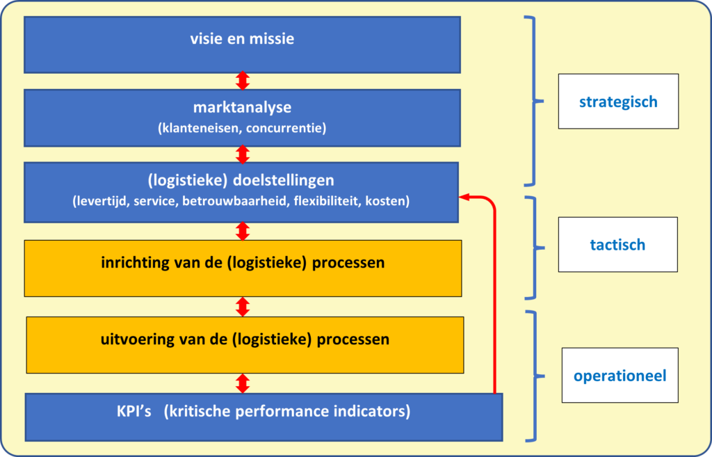 In het schema zijn het strategisch-, tactisch- en operationeel niveau aangegeven. We hebben in het schema het woord logistiek tussen haakjes gezet, om aan te geven dat het basismodel ook geschikt is voor bijvoorbeeld een dienstverlenende organisatie.