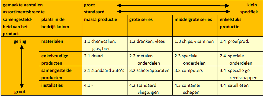 We laten in tabel 1 een typologie van bedrijven zien, die is ontwikkeld door Botter. De verticale indeling in klassen is op basis van de complexiteit van het product (die wordt door Botter de samengesteldheid genoemd). Volgens Botter is er een grote correlatie tussen de complexiteit van het product en de plaats van de onderneming in de bedrijfskolom. Door de eerste en de tweede kolom in de matrix wordt de mate van complexiteit gekoppeld aan de plaats van de onderneming in de bedrijfskolom, waardoor verticaal gezien 4 klasses ontstaan. Een fabrikant van bouten en moeren levert enkelvoudige producten, dus weinig complex, zijn plaats is derhalve in de tweede rij van boven in de matrix (op één na bovenste lichtgele rij).