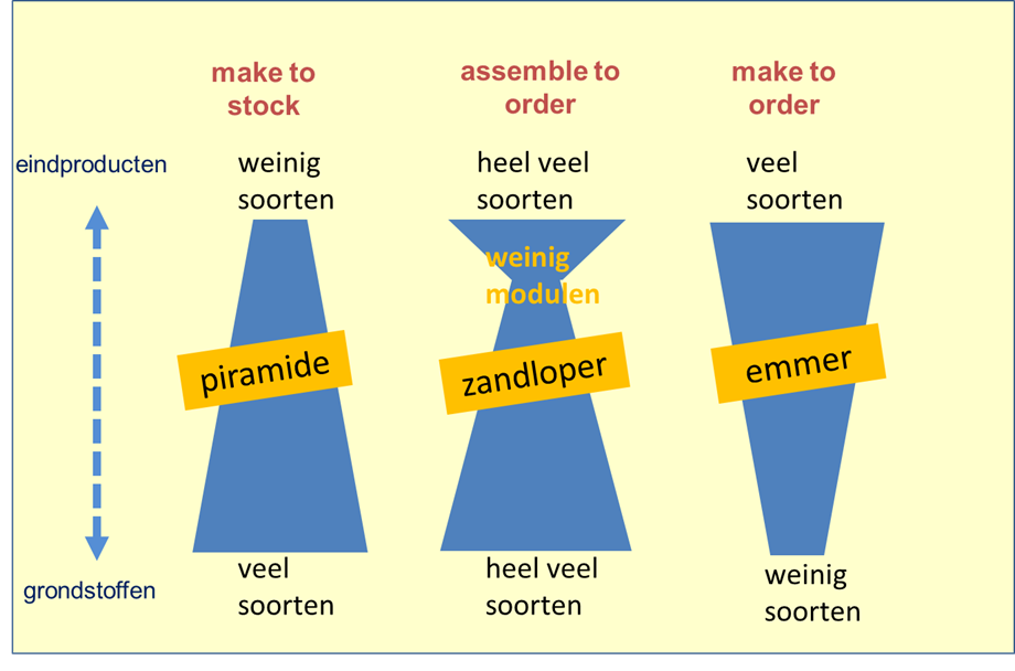 Een voorbeeld van een indeling naar de procesvorm van productiebedrijven. Die vorm zal in veel gevallen gelijk op lopen met de vorm van het productieproces. Hoe dichter bij de consument, hoe breder het assortiment: de diabolovorm. Hoe verder stroomopwaarts, hoe minder soorten materiaal worden gebruikt: de emmer.