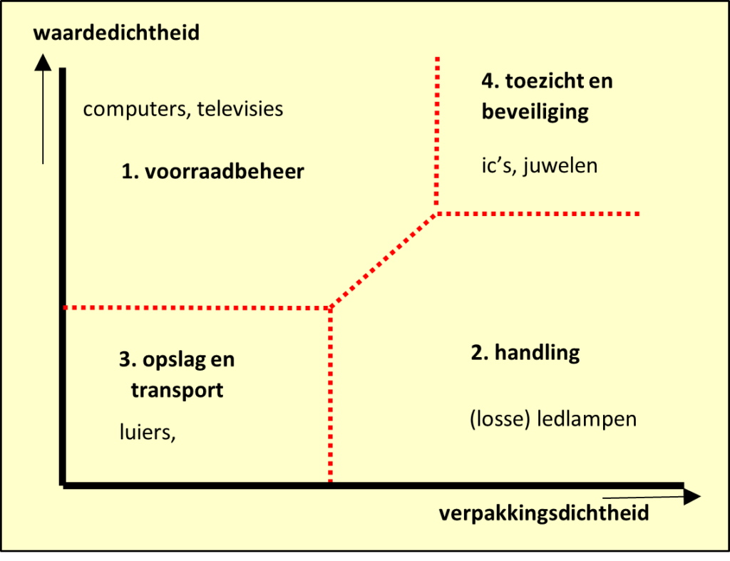Gebied 4. Tenslotte is er een gebied, waarin zowel de waardedichtheid als de verpakkingsdichtheid hoog zijn. Veel pakjes, met een kostbare inhoud. Omdat ieder mens er recht op heeft om niet in verleiding te worden gebracht, is er voor transport, opslag en handling bij een dergelijk assortiment veel toezicht en beveiliging nodig.