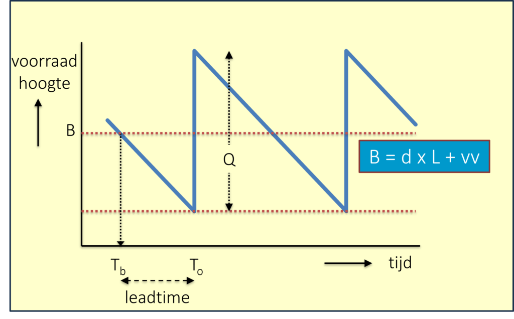 Het bestelniveau B hangt af van het te verwachten verbruik tijdens de leadtime, plus de veiligheidsvoorraad die afhangt van de kans dat er gedurende de levertijd meer dan het gemiddelde wordt gevraagd.