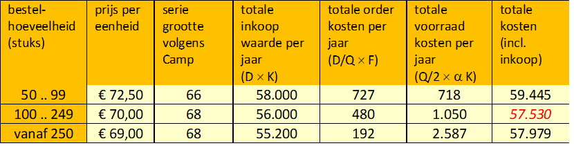 Uit de analyse blijkt dat een bestelserie van 100 eenheden met een prijs van € 70,- de laagste totale kosten op jaarbasis geeft.
