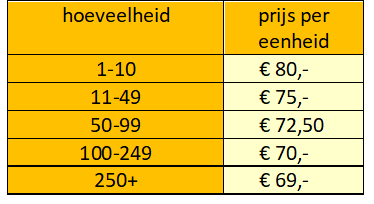 Nog wat lastiger wordt het als je te maken hebt met een prijsstaffel. Naarmate je meer tegelijk koopt, wordt je korting hoger. Nu kom je er niet uit met één keer vergelijken van de totale kosten met of zonder korting. Meestal zul je een aantal treden van de ‘korting-ladder’ met elkaar moeten vergelijken. We zullen een werkbare methode aan je voorleggen en die nader toelichten met een praktijkvoorbeeld.