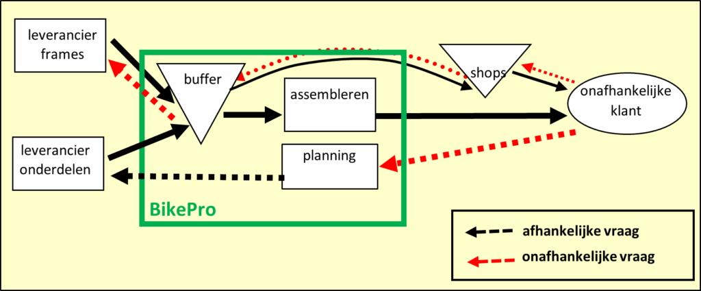 De meeste artikelen in de buffer hebben dus een bestemming, omdat ze voor deze of voor volgende week in het productieplan staan. Een klein deel van de voorraad in de buffer heeft nog geen bestemming, die voorraad is bedoeld voor de nog onbekende klant die met zijn/haar fiets bij de shop komt en rekent op snelle reparatie.