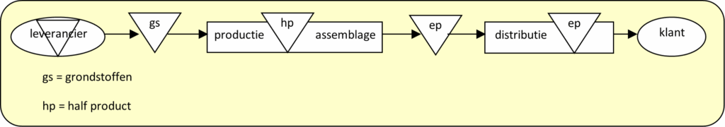In onderstaande figuur tonen we een keten in schemavorm, met rechthoeken voor de processen, driehoeken voor de voorraden en ovalen voor begin en eind, voor leverancier en klant. Als je de keten vanaf de leverancier tot aan de klant volgt, zie je dat er op meerdere plaatsen in de keten voorraden aanwezig zijn. In dit voorbeeld grondstoffen, halffabricaat en gereed product