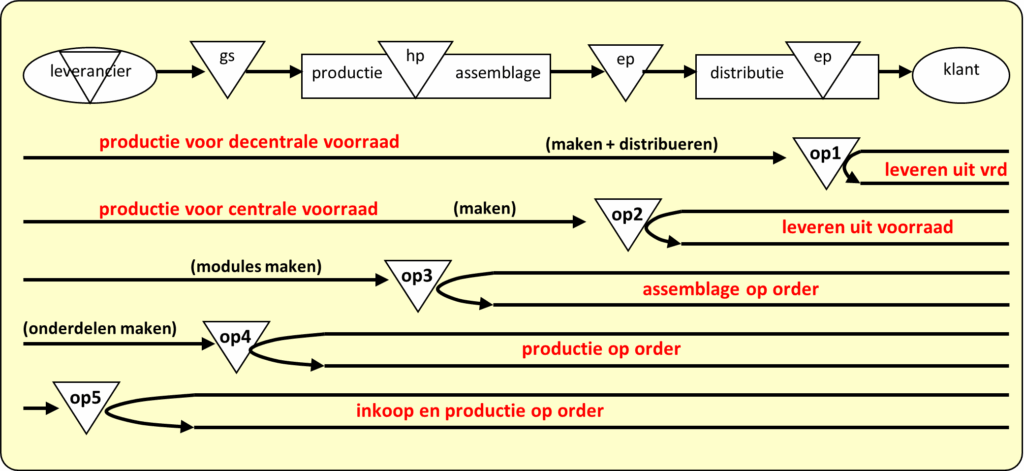 Als je kosten wilt verlagen of flexibiliteit wilt vergroten, moet je het ontkoppelpunt stroomopwaarts verschuiven. Maar daar zit een ‘natuurlijke’ rem op: elke verschuiving stroomopwaarts betekent een verlenging van de doorlooptijd van een klantenorder. Het KOOP kan maar zó ver naar links, als de markt toelaat. De kwestie waar het om gaat, is: “hoe lang wil/kan de klant op het product wachten”. Wil je betere service bieden en kunnen ingaan op specifieke klantenwensen? Schuif dan het KOOP zoveel mogelijk naar rechts. Ook hier is er een ‘natuurlijke’ rem, je kunt niet verdere naar rechts als de kosten van voorraad en het verlies van productie efficiëntie de kostprijs zover verhogen, dat niet meer tegen goede verkoopprijzen kan worden aangeboden.