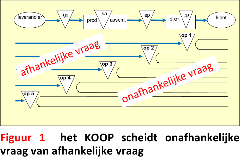 Stroomopwaarts van het KOOP is de behoefte aan materialen (de bestellingen of orders) afhankelijke vraag: deze orders kunnen afgeleid worden van een behoefte die op een meer stroomafwaarts gelegen plaats in de keten is ontstaan.