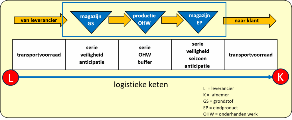 In figuur 4 hebben we schematisch aangegeven welke soorten voorraad waar in je onderneming zouden kunnen liggen. Naast de genoemde soorten ontkoppelvoorraad, kan er ook voorraad worden gevormd om een geheel ander functie te vervullen. We komen daarop terug in Hoofdstuk 9.